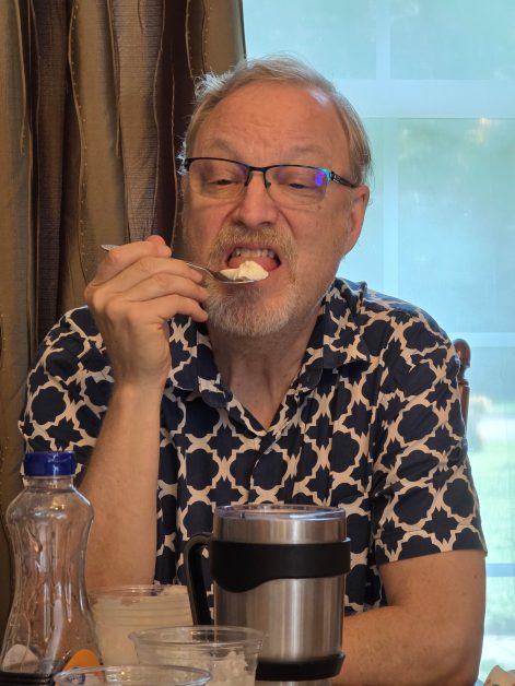 Sarah and Gage contributed fruit smoothies; Madison helped Gage prepare them and deliver them to the table. They were fabulous, topped as they were with a little squirt of whipped cream and passion fruit granola.