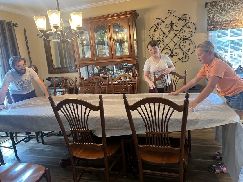 The younger generation took charge of expanding the table and arranging the tablecloth.