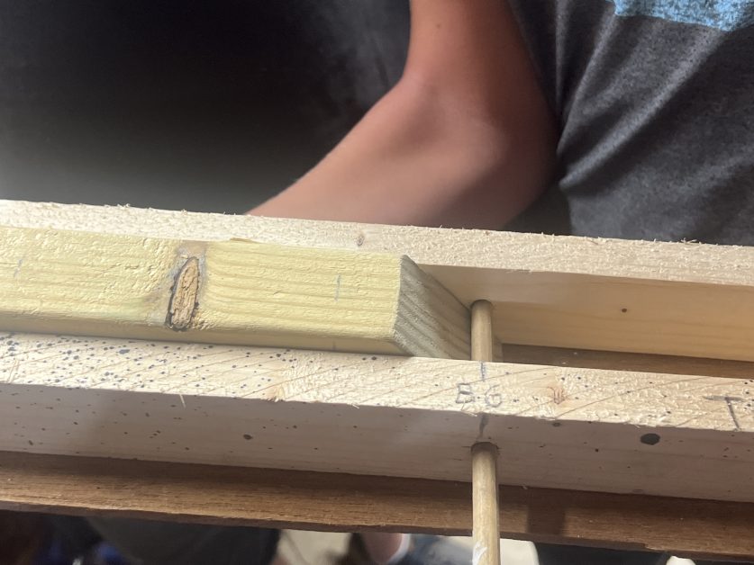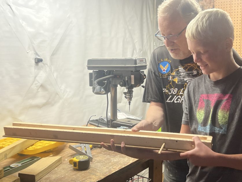 Yesterday afternoon, they went down to the basement and worked on the initial stages of drilling four holes in each of fifty spindles. (Which will be used for our deck.) I don’t quite understand it all, but it was something about setting up a template so the holes could be drilled in the same location on every spindle, and doing counter-sinking and using a reaming tool. (I’m not quite sure why they haven’t invited me and my vast wisdom to help.)