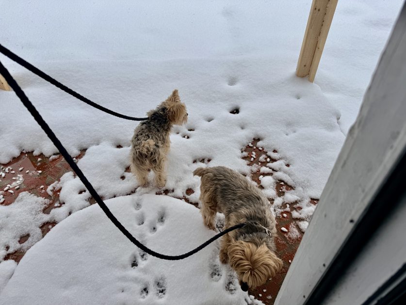 Tinker and Belle were not entirely thrilled with the white, freeze-y stuff, but they valiantly went out to do their big and brave business and then zoomed right back inside again.