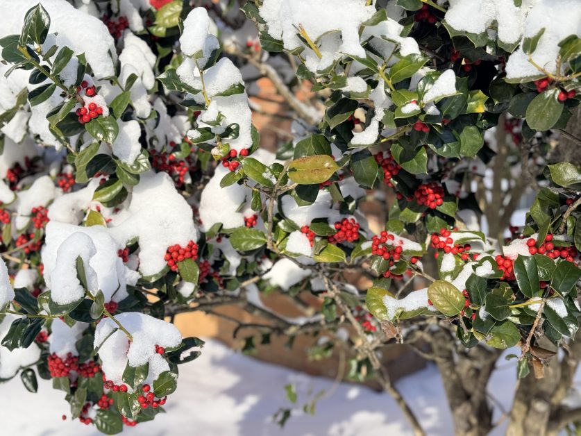No quiet colors here! The array of bright red, vivid green, and stark white all gathered together on this holly bush was striking. As always, my compliments to the Creator.