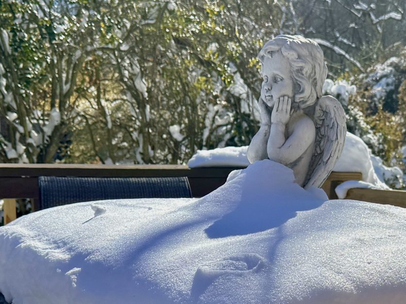 Our deck angel grew a pompadour and then . . .