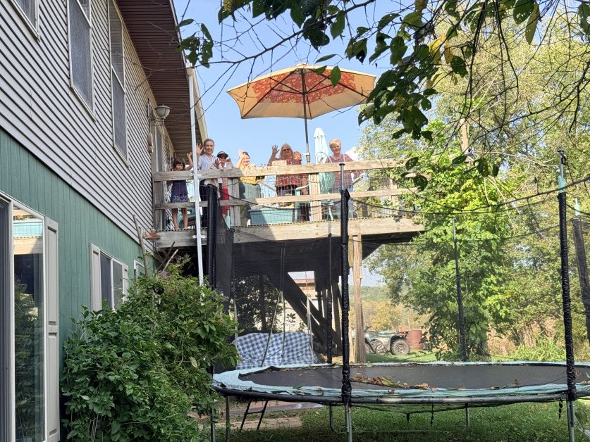 the other folks were up on the deck talking, which was a bit of a challenge, because we never knew from moment to moment whether there would be a gunshot or a kaboom to interrupt our conversation. But we persevered and managed to share plenty of stories and laughter despite the chicken poo cacophony.