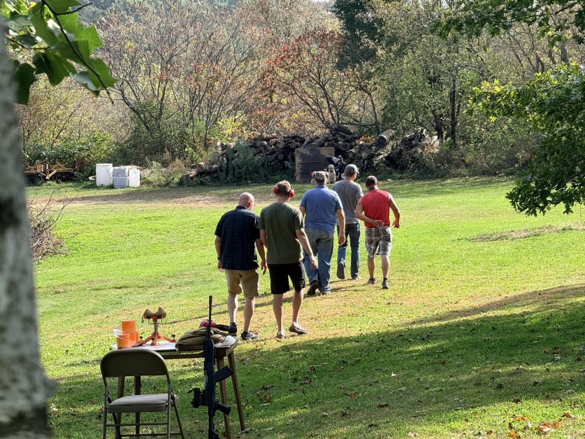 This deceptively simple target exercise was actually a complicated process, wherein the collection of men had to walk back and forth from the shooting station to the chicken poo station, examine the target, rearrange a few things, and ensure everything was set as it should be. Then there were a good many shots until finally someone would hit it, and there would be a huge kaboom, followed by a great round of cheering.