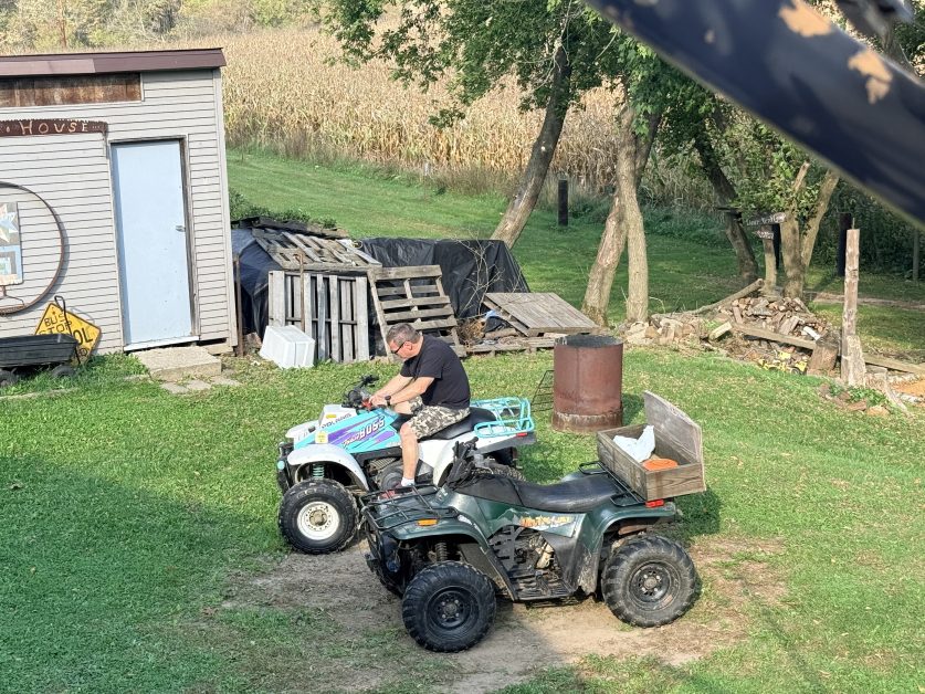 the activities consisted of watching my nephew feed their cow, dodging a few dogs and chickens, boarding a wagon for our traditional hay-less hay-ride, riding four wheelers, playing basketball and disc golf, and shooting a variety of guns at a variety of targets in the outdoor shooting range.