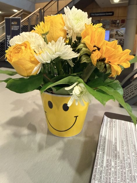 I think it’s great to get gifts and flowers on anniversaries, Valentine’s Day, etc., but I think the best time to give them is when it’s completely unexpected. I got to spend the whole week telling people the flowers were from my husband of 44 years, and he’d told me I was his sunshine. It brought so many smiles to so many faces.
