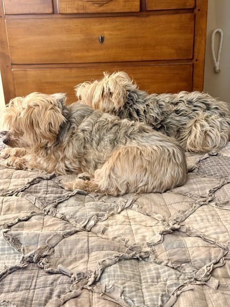 The usual morning routine is that Steve’s alarm goes off at 6:30 a.m. The dogs (who sleep with us) leap up and start ruffing and running around the bed, rolling over, scratching their backs, and giving into the zoomies, all the while keeping a close eye on Steve so they’re ready for the next phase–Steve bringing out their leash. When they see that, they both go to the foot of the bed and sit there together waiting for him to hook it up to their collars, set them on the floor, and take them outside.