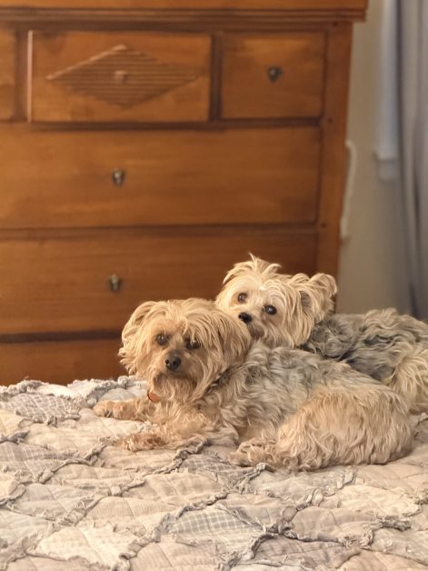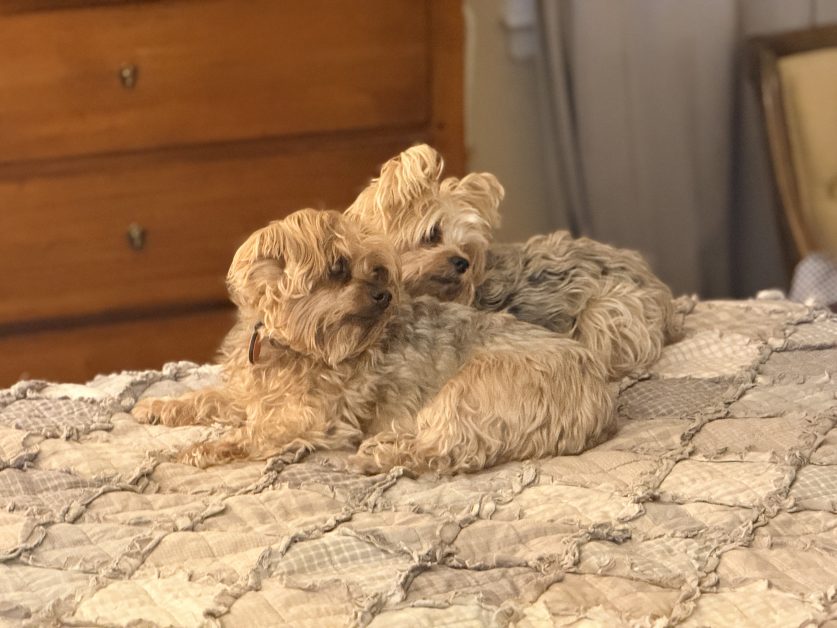 Steve’s alarm went off, and instead of two Yorkies leaping about and having fun while waiting for him to leash them up, Tinker went and lay by himself, facing away from the room and away from Steve. It didn’t take long for his sister to take a quick assessment of the changed circumstances, and then plop her sympathetic little self right down beside him.