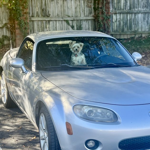Steve took this photo while coming out of a store.  Belle is almost always on the lookout, scanning the area for items of interest and potential danger. She then reports her findings to Tinker, who is usually hunkered down out of sight, pondering whatever it is he is always pondering.