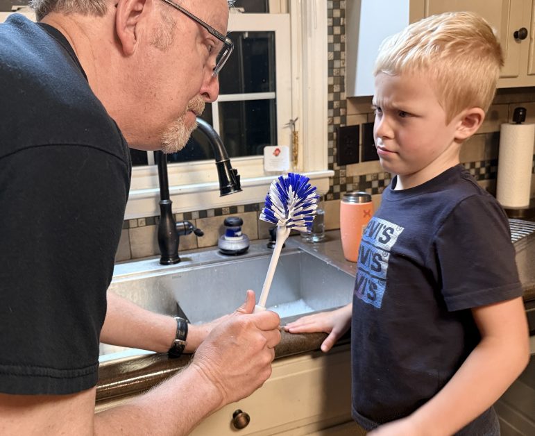 Steve was going to show Andrew how he washes the travel mug I use for protein shakes, but got a little silly in the process.  He gravely held up the scrub brush and said, “Andrew, this is what I use to clean my nose.”