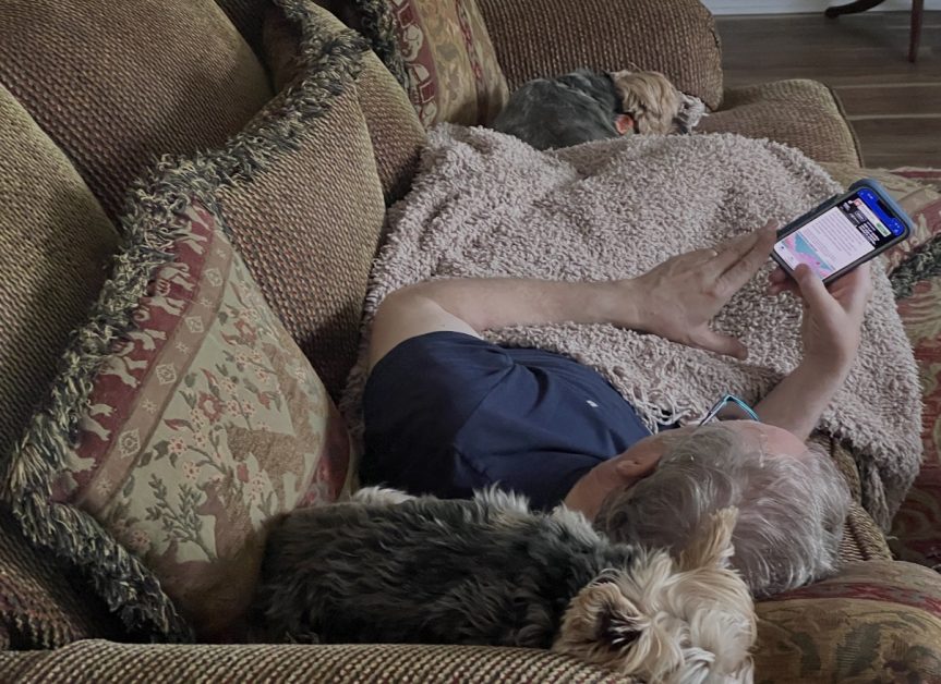 Helping dad rest and check the weather report.