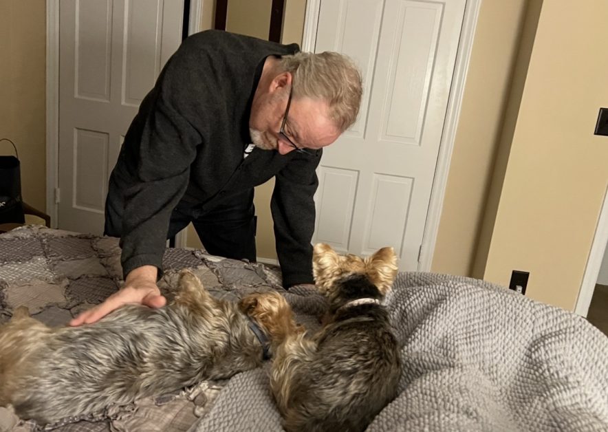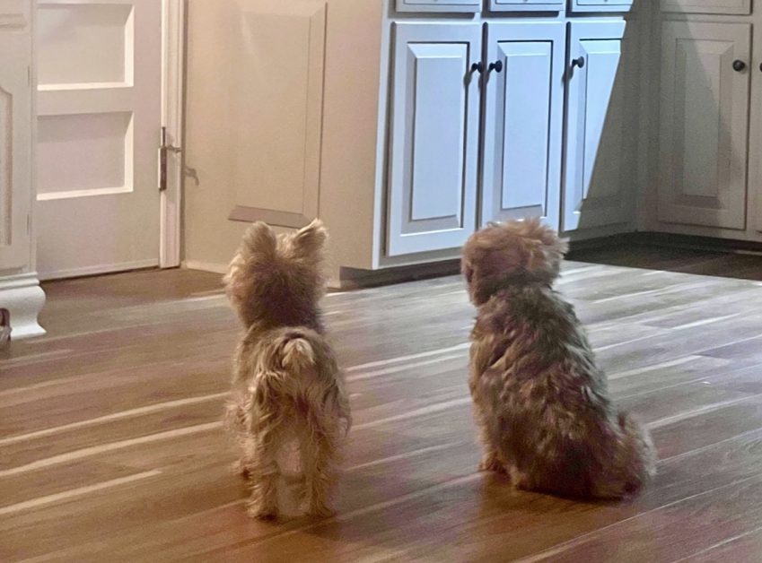 Waiting at the edge of the bed in the morning for Steve to hook them up to the leash and take them outside to their very cold and also freezing and also icy restroom facilities.